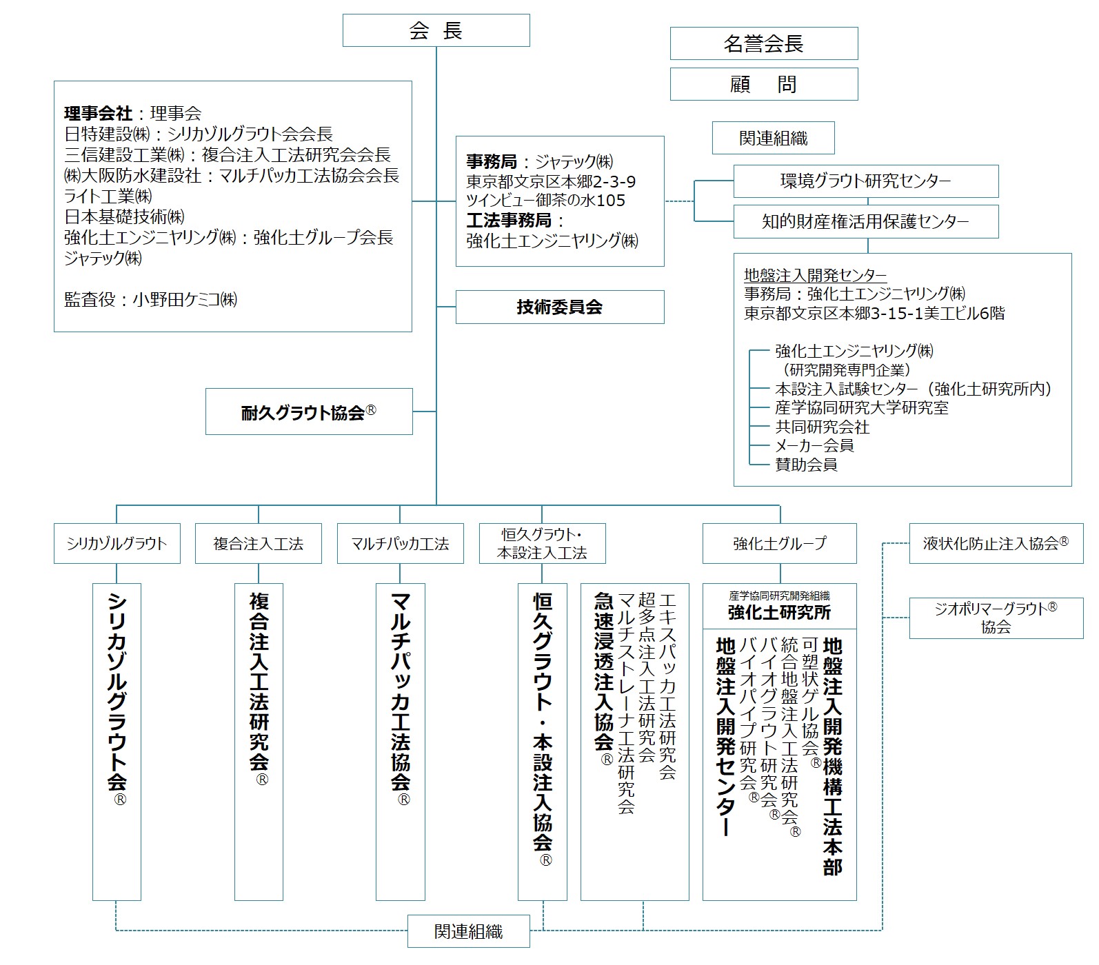 地盤注入開発機構は機構の扱う各技術を用いて工事を行う法人(正会員)、各技術に関する機械、器具、材料等の製造会社又は、商社(賛助会員)、各技術に関する研究開発に関する会員(賛助会員)、各技術の工業所有権者(特別会員)で構成されています。 さらに各協会内に材料、工法により部会、研究会があります。